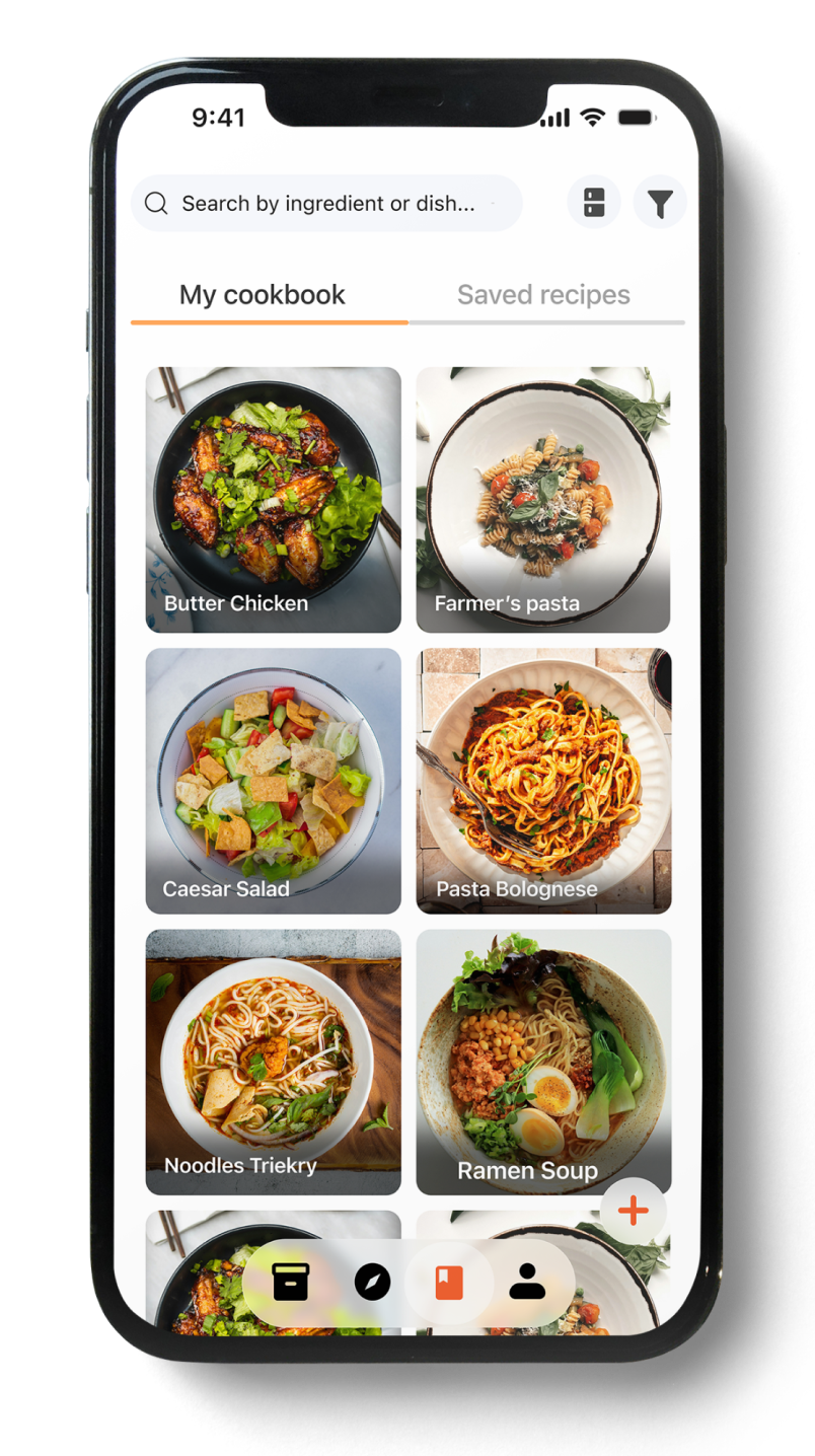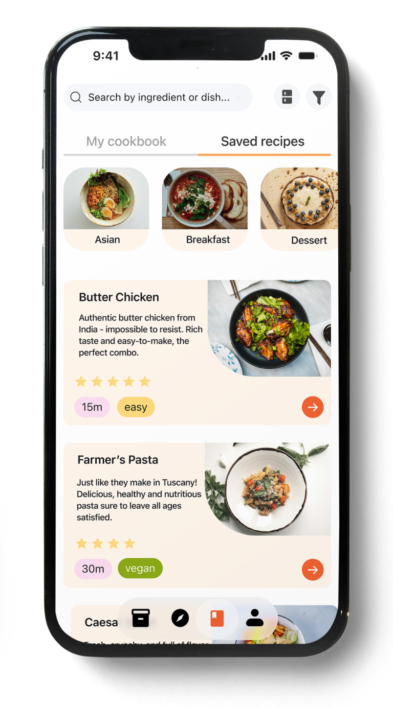 The cookbook tabs page provides access to both saved recipes from across the app, and personal recipes added by the user (the ‘cookbook’).